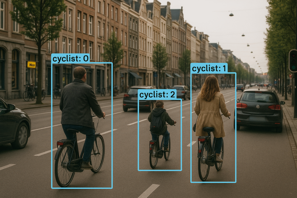 • Cyclist flow insights: Count cyclists, track peak usage hours and measure compliance with bicycle street rules.